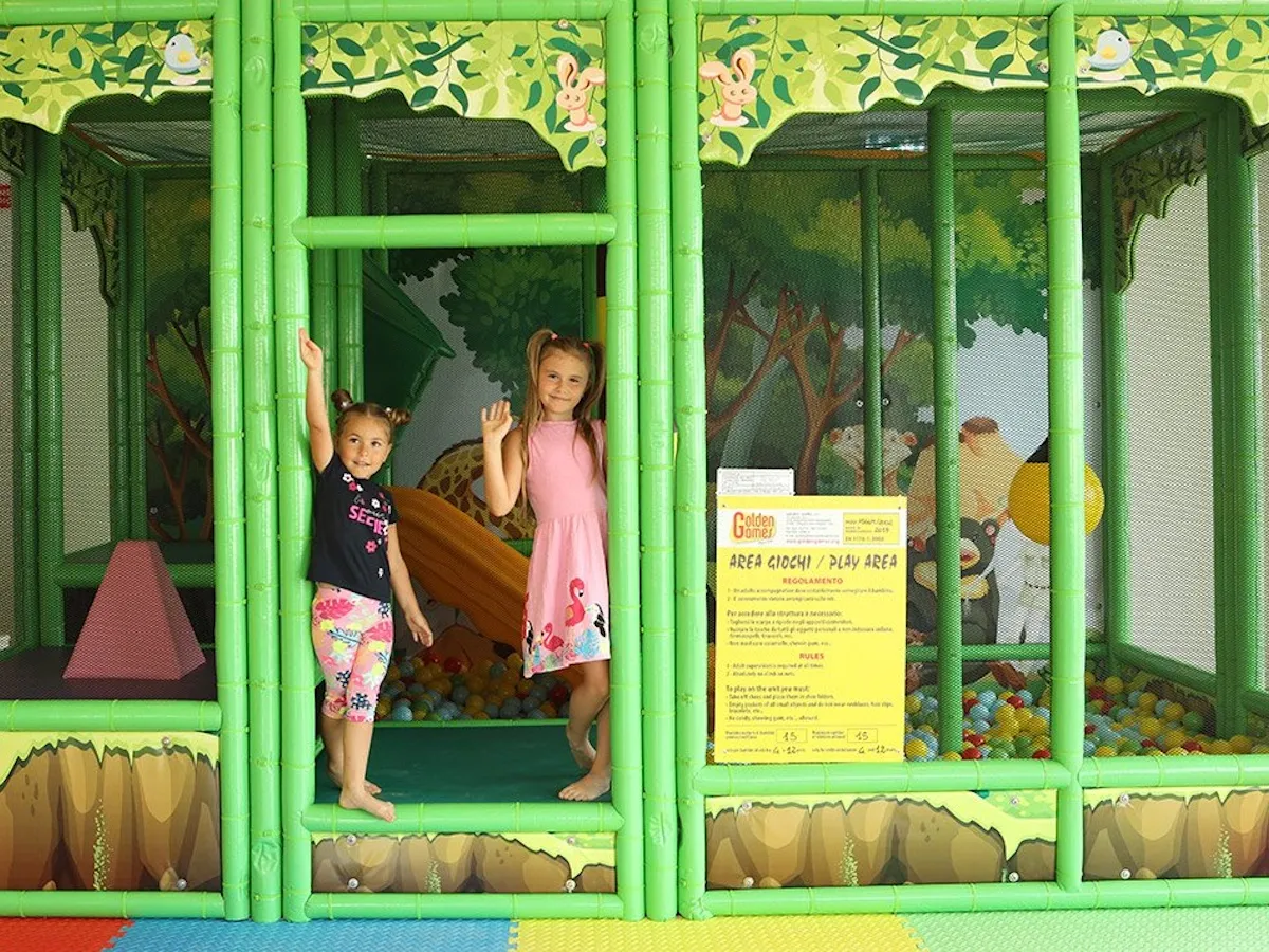 The product is equipped with no. 3 ball punches, no. 1 ball pit, no. 1 soft pyramid hurdle, no. 1 wrecking-ball hurdle and no. 1 slide made of antistatic and 100% recyclable roto-moulded polyethylene