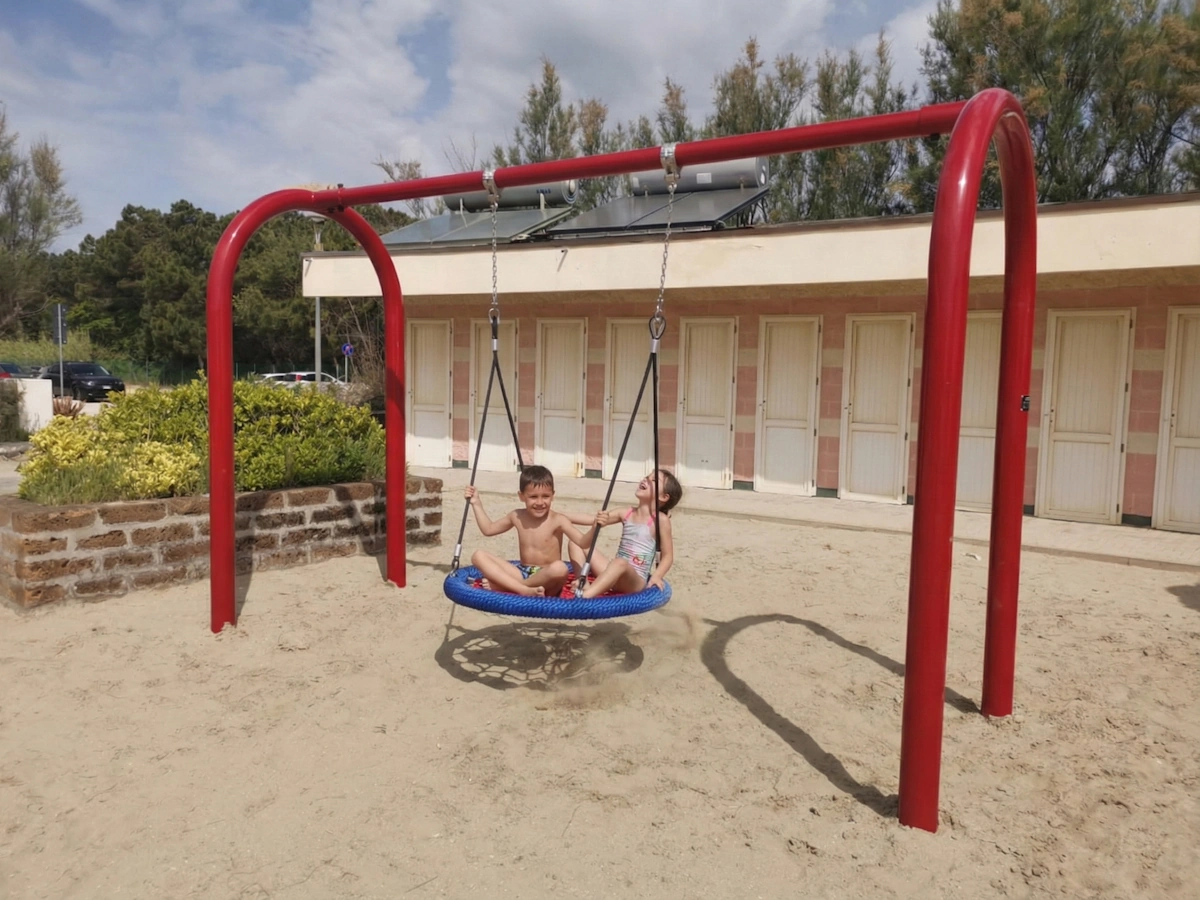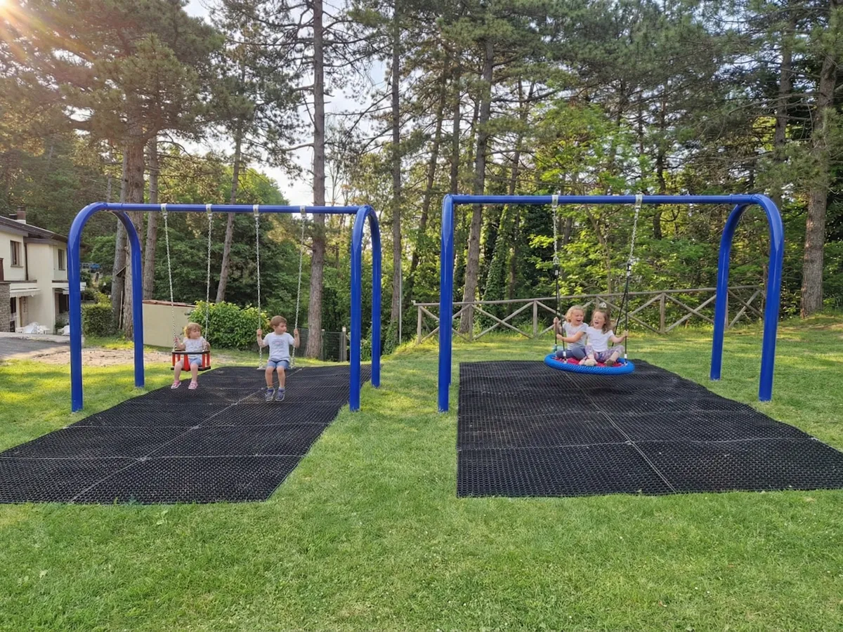 Balançoire extérieure inclusive conçue pour les aires de jeux publiques et conforme à la norme EN 1176. Le cadre en acier galvanisé ne nécessite aucun entretien. Boulons en acier inoxydable 304. Cette version comprend un panier multi-place (3-12 ans) Ø 1000 mm composé de fils d’acier et d’un revêtement en polypropylène de 6 mm. Revêtement du périmètre en caoutchouc résistant aux chocs, aux intempéries et au vandalisme.
