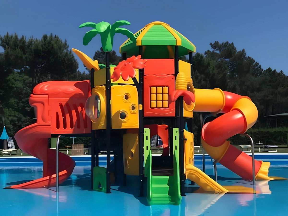 Fantacastelli® conçu pour être positionné au bord de la piscine. L’inclinaison des toboggans à 30° permet une utilisation à sec. Possibilité d’insérer de l’eau à l’intérieur des toboggans et/ou des jets d’eau de sujets thématiques, grâce à l’installation d’un système hydraulique escamotable avec tuyaux en polyéthylène à connexion rapide, raccords en PVC collés et buses en PET. Les sections des toboggans contenant de l’eau sont isolées grâce à l’utilisation de joints EPDM.