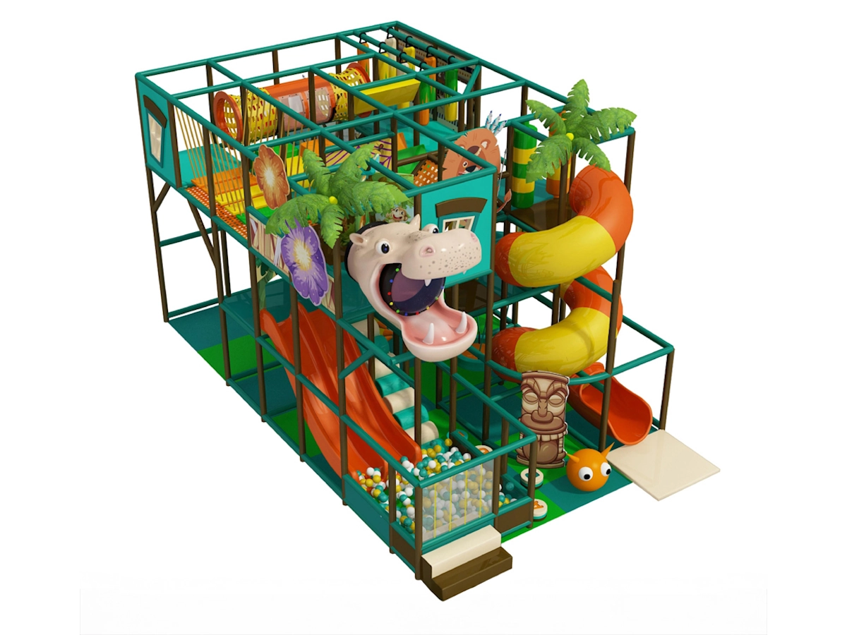 Grande structure de jeux d’intérieur sur le thème de la jungle, idéale pour les ludothèques, les centres de divertissement familial (FEC), les centres commerciaux, les espaces d’anniversaire et les espaces intérieurs pour enfants.