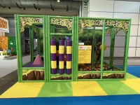 Aire de jeux intérieure jungle-themed fabriquée avec le “Panel-System”, un système innovant de panneaux pré-assemblés qui est extrêmement rapide à assembler et facile à étendre.