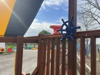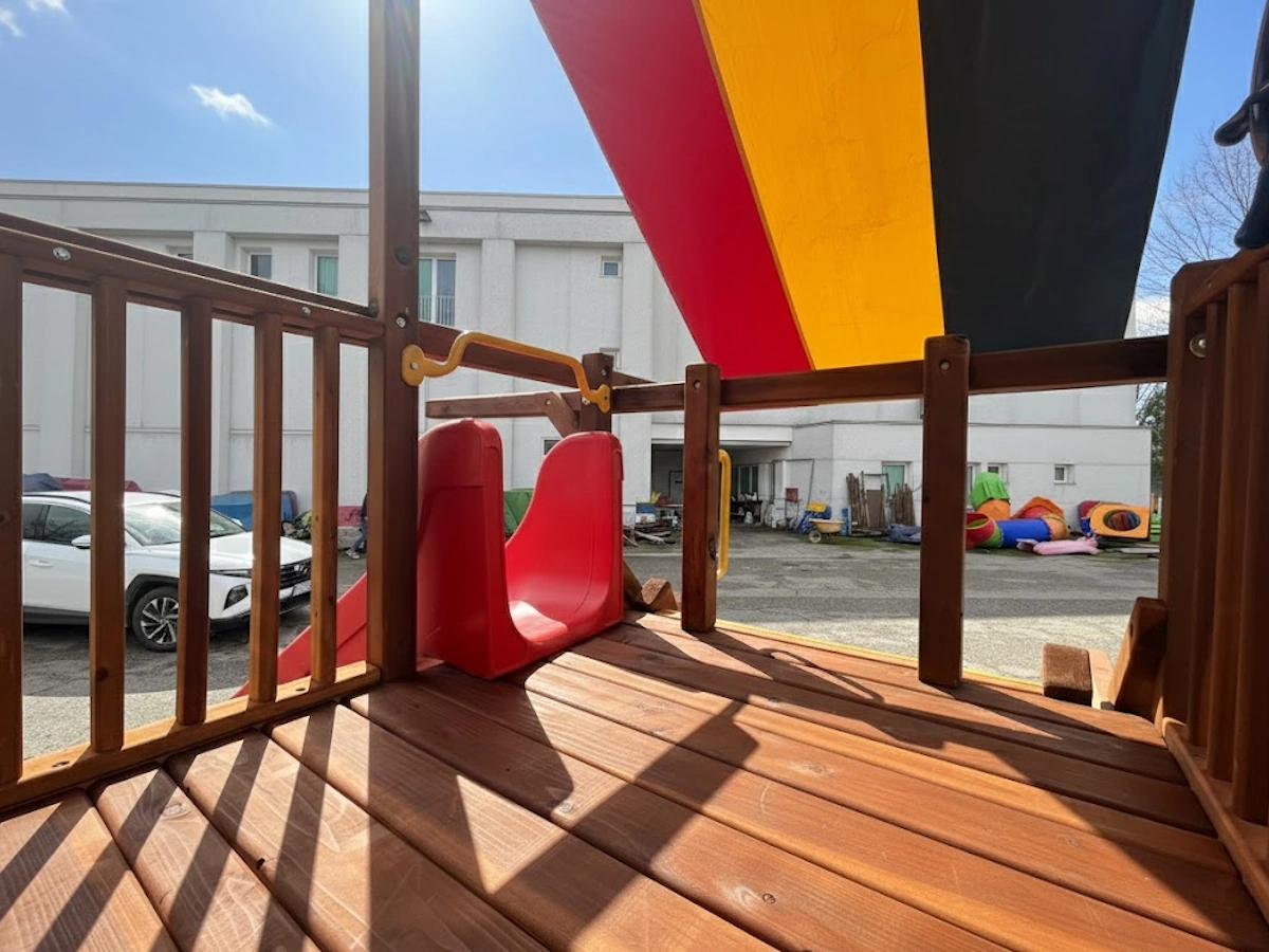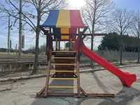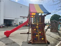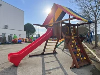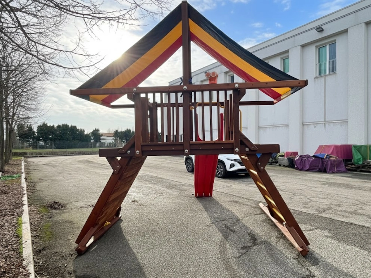 Articolo installato a scopo espositivo. Realizzato in legno di cedro Cunninghamia con trattamento in autoclave. La struttura è completata da dettagli resistenti in PVC (tetto e bandierine) con scivolo h 150 cm con spessore maggiorato 10 mm realizzato in LLDPE rotostampato (100% riciclabile, contributo PolieCo assolto) di alta qualità, antistatico e resistente ai raggi ultravioletti;