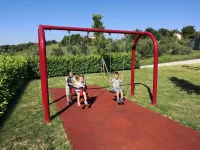 Altalena per esterni progettata per aree gioco ad uso pubblico e conforme alla UNI EN 1176. Il telaio in acciaio zincato non necessita di alcuna manutenzione ed è disponibile in diverse colorazioni. Bulloneria in acciaio inossidabile 304. In questa versione sono inclusi un seggiolino tavoletta (3-12 anni) e un seggiolino cestello (1-3 anni).