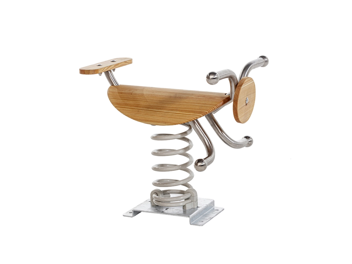 Gioco a molla a forma di racer realizzato con sedute in legno di larice lamellare di alta qualità e telai in acciaio inossidabile 304, 100% riciclabile, antistatico e resistente ai raggi ultravioletti.