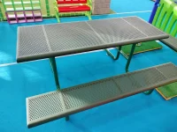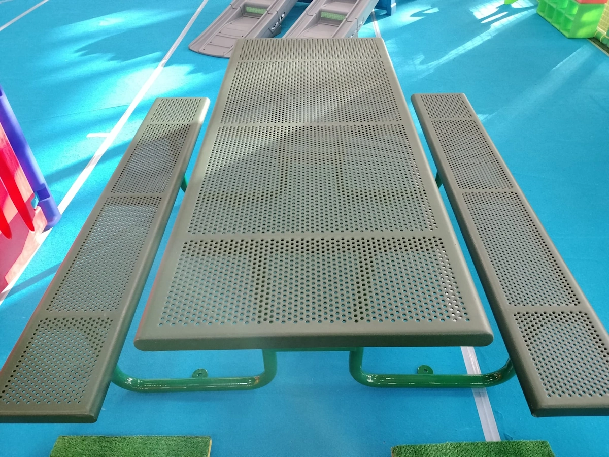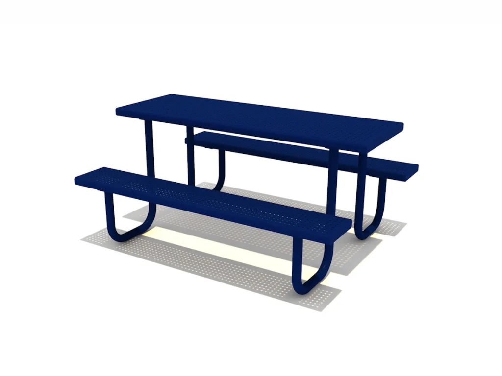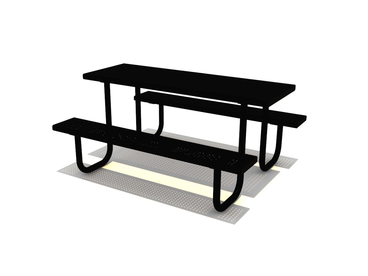 Realizzato in acciaio zincato, assicura elevata resistenza alla corrosione e agli agenti atmosferici, garantendo stabilità e lunga durata nel tempo anche in contesti ad alta frequentazione. Il piano del tavolo e le sedute sono rivestiti in gomma, una finitura antiscivolo che migliora comfort e sicurezza durante l’utilizzo.